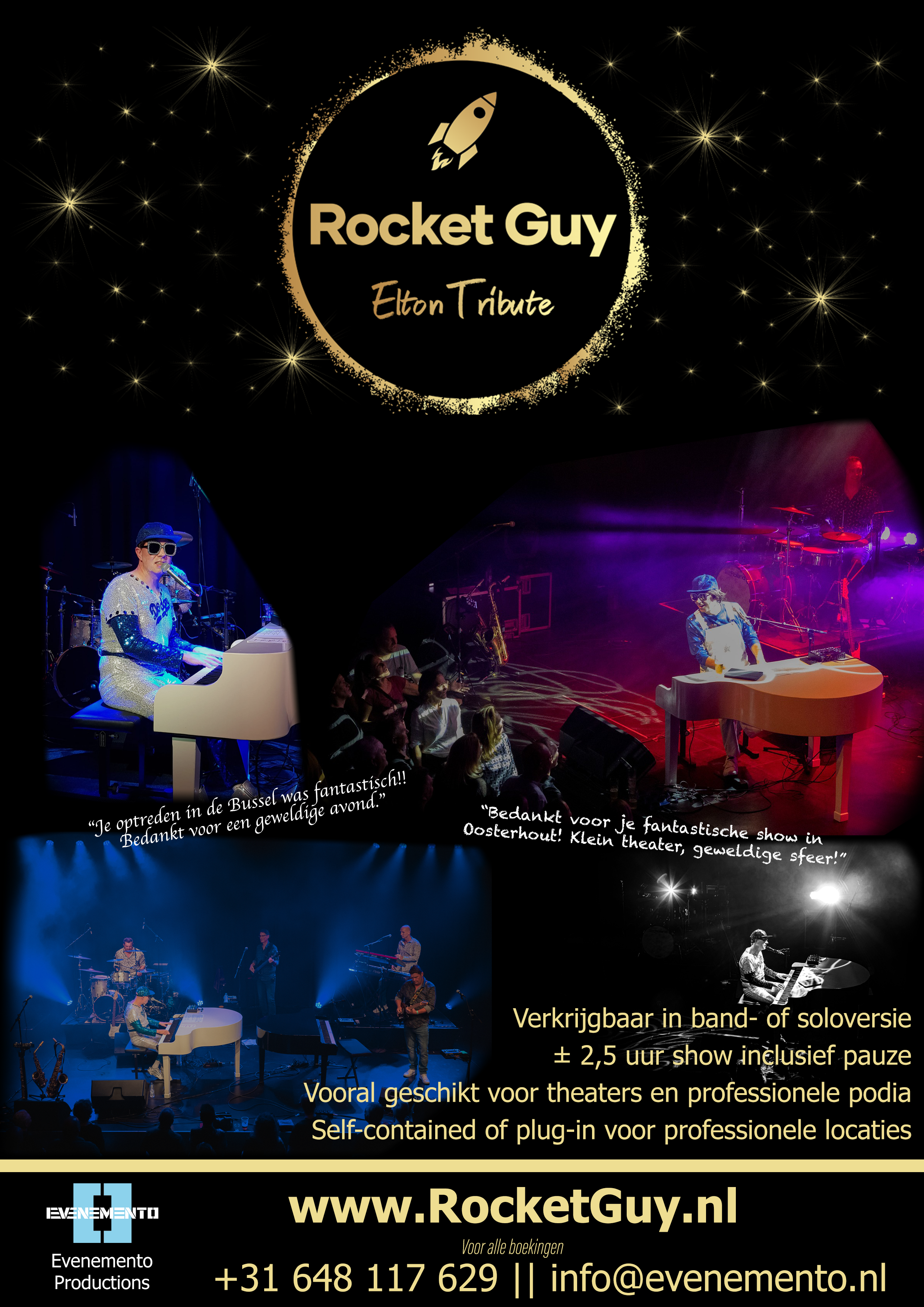2.5 hours of the greatest hits of Elton John, with typical British humour, crystal clear vocals, emotion and spectacular costumes, reliving the glory and pomp of the world’s greatest piano showman!